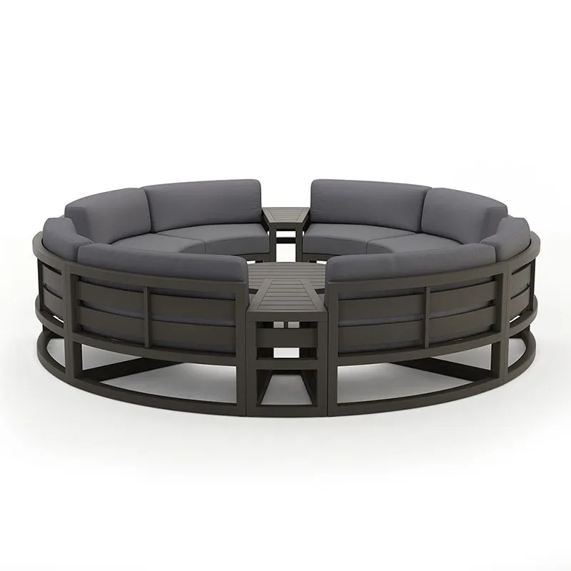 Okrągły design tej zewnętrznej kanapy jest nie tylko wizualnie uderzający, ale także funkcjonalnie innowacyjny. Zachęca do interakcji społecznych, pozwalając wszystkim stanąć naprzeciwko siebie, co czyni ją idealną na spotkania. Kształt idealnie wpasowuje się w różnorodne ustawienia na zewnątrz, od przestronnych tarasów po intymne zakątki ogrodowe, maksymalizując przestrzeń do siedzenia, a jednocześnie dodając wyrafinowany punkt centralny.